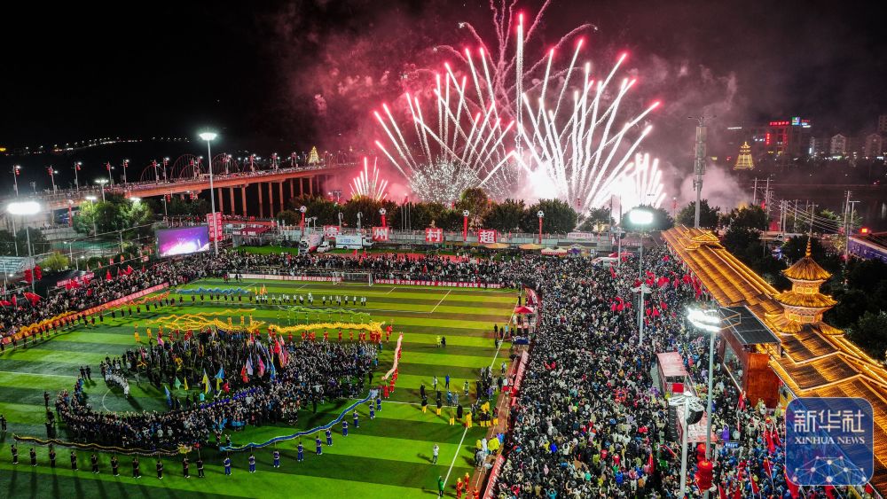 2024年2月3日,音樂煙花秀在“村晚”上演(無人機(jī)照片)。當(dāng)日,2024全國“村晚”示范展示活動(dòng)暨貴州“村超村晚”在貴州省黔東南苗族侗族自治州榕江縣拉開帷幕?;顒?dòng)包括“村超村晚”文藝展示、2024龍年“村超”賀歲戰(zhàn)等內(nèi)容。新華社記者 劉續(xù) 攝