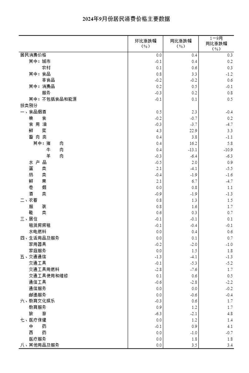 2024年9月份,全國居民消費價格同比上漲0.4%。其中,城市上漲0.4%,農(nóng)村上漲0.6%;食品價格上漲3.3%,非食品價格下降0.2%;消費品價格上漲0.5%,服務(wù)價格上漲0.2%。1—9月平均,全國居民消費價格比上年同期上漲0.3%。