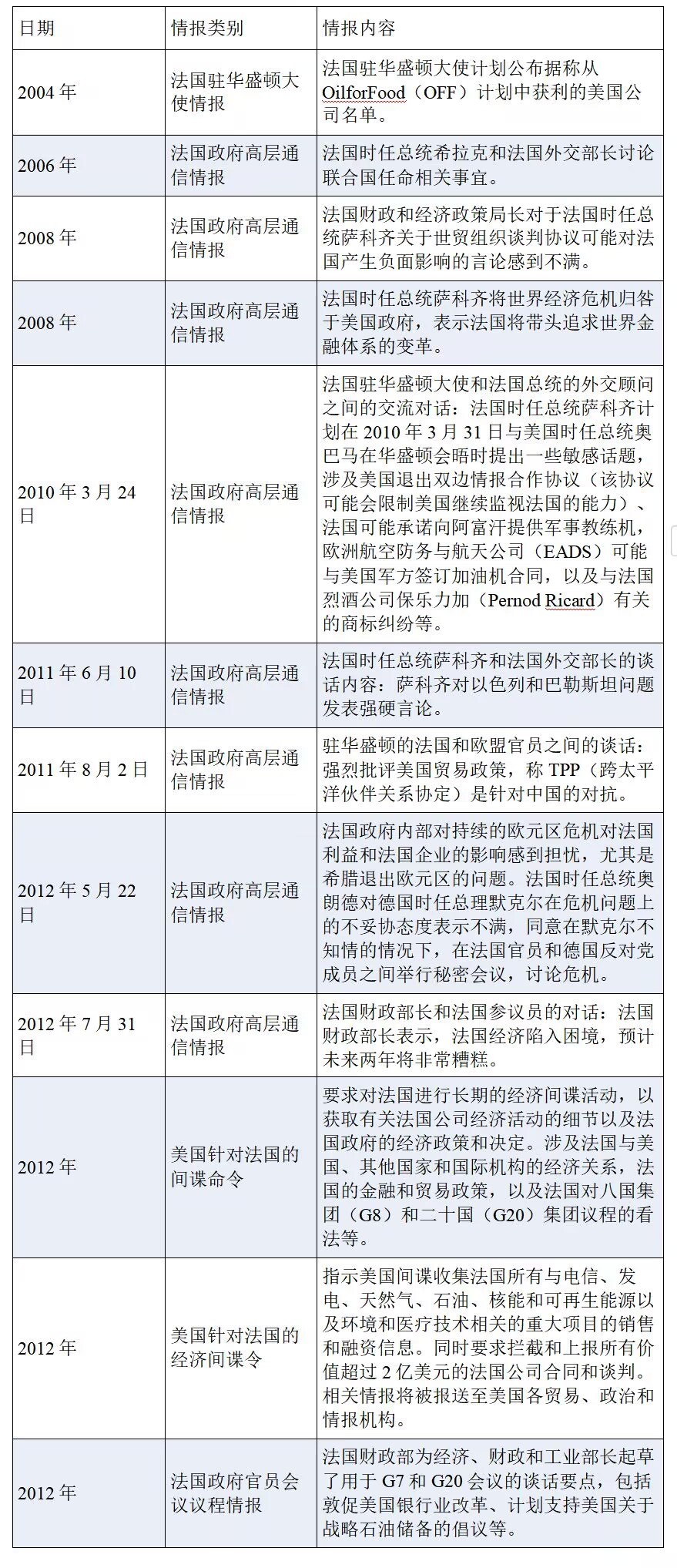 在2004年至2012年期間,美國對法國實(shí)施了長期的間諜行動,監(jiān)聽對象包括前法國總統(tǒng)、法國財政部長、法國外交部長、法國參議員、法國財政和經(jīng)濟(jì)政策局官員、法國駐美國大使,以及直接負(fù)責(zé)歐盟貿(mào)易政策的官員等。監(jiān)聽內(nèi)容涉及法國政府政策、外交、金融、國際交流、基礎(chǔ)設(shè)施建設(shè)、商業(yè)和貿(mào)易活動等,其中一些重要情報被美國授權(quán)與“五眼聯(lián)盟”伙伴國家共享,揭示了“五眼聯(lián)盟”國家亦為美國間諜行動的獲益者。