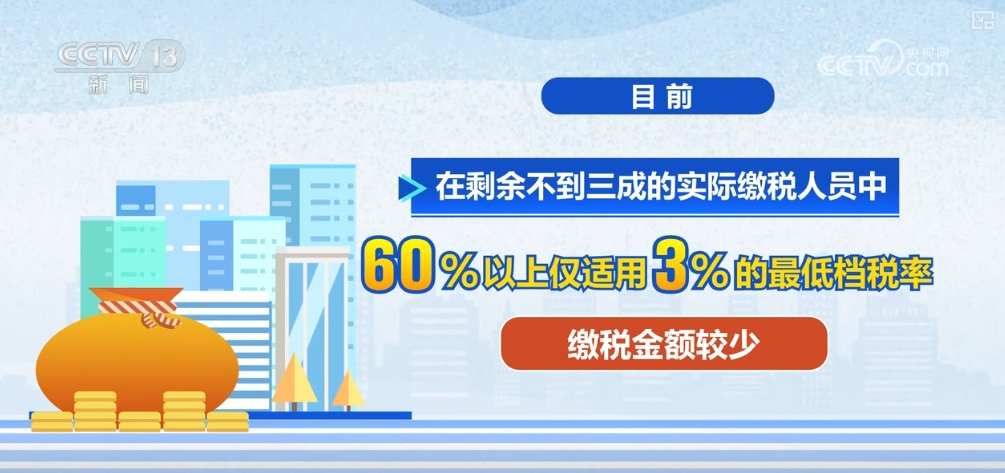 國家稅務(wù)總局稅收數(shù)據(jù)顯示,目前,我國取得綜合所得的人員中,無需繳納個稅的人員占比超過七成,在剩余不到三成的實際繳稅人員中,60%以上僅適用3%的最低檔稅率,繳稅金額較少。