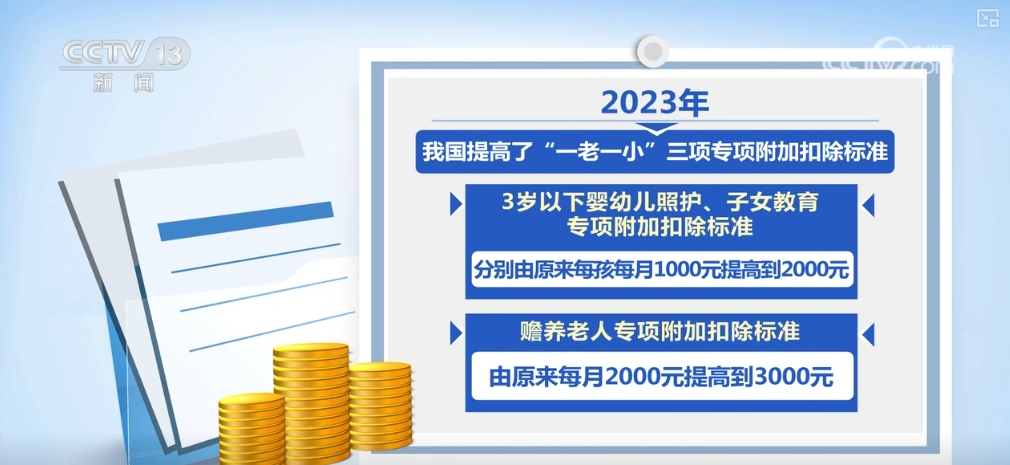 據(jù)介紹,2023年,我國提高了“一老一小”三項專項附加扣除標(biāo)準(zhǔn)。3歲以下嬰幼兒照護(hù)、子女教育專項附加扣除標(biāo)準(zhǔn),分別由原來每孩每月1000元提高到2000元,贍養(yǎng)老人專項附加扣除標(biāo)準(zhǔn)由原來每月2000元提高到3000元。