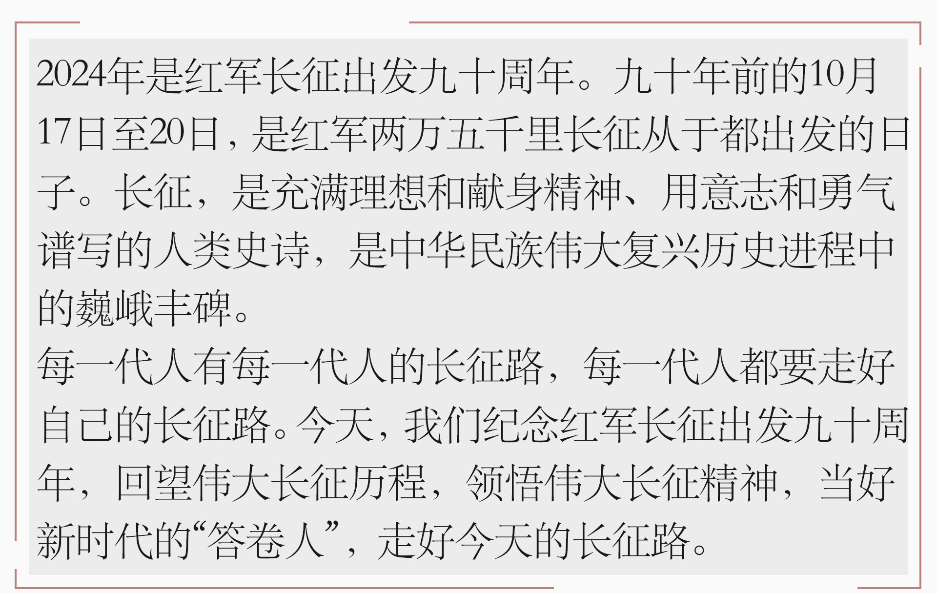 長(zhǎng)征是一次理想信念的偉大遠(yuǎn)征。中國(guó)共產(chǎn)黨領(lǐng)導(dǎo)紅軍,以非凡的智慧和大無(wú)畏的英雄氣概,戰(zhàn)勝千難萬(wàn)險(xiǎn),付出巨大犧牲,勝利完成震撼世界、彪炳史冊(cè)的長(zhǎng)征,實(shí)現(xiàn)了中國(guó)共產(chǎn)黨和中國(guó)革命事業(yè)從挫折走向勝利的偉大轉(zhuǎn)折,開(kāi)啟了中國(guó)共產(chǎn)黨為實(shí)現(xiàn)民族獨(dú)立、人民解放而斗爭(zhēng)的新的偉大進(jìn)軍。