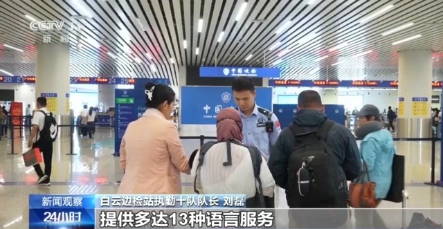 白云邊檢站執(zhí)勤十隊隊長 劉磊:現(xiàn)場這邊的8條通道設(shè)置為廣交會專用通道,包括從廊橋到通道前,全程都設(shè)置了指引標志和引導民警,提供多達13種語言服務(wù)。