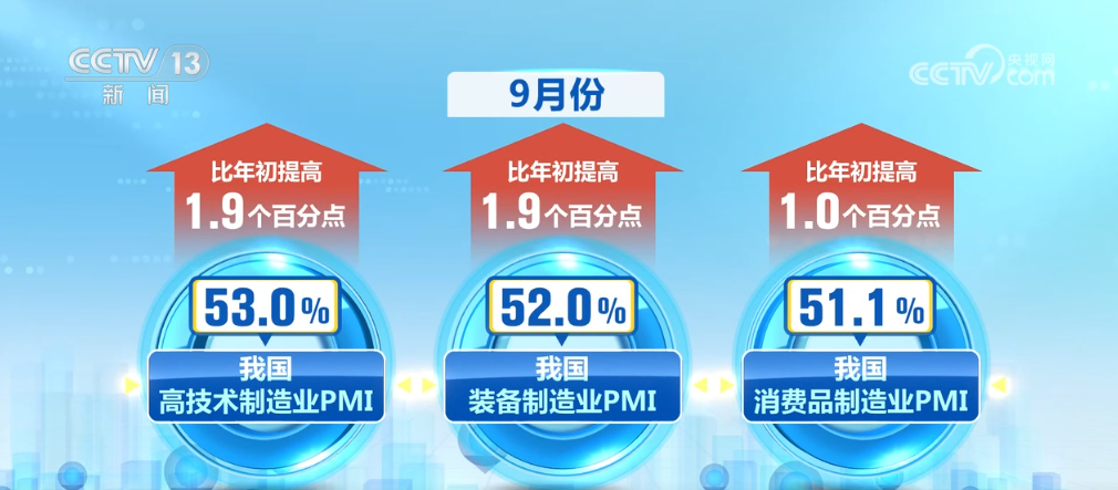 9月份,我國高技術(shù)制造業(yè)、裝備制造業(yè)和消費品制造業(yè)PMI分別為53.0%、52.0%、51.1%,比年初提高了1.9個、1.9個、1.0個百分點。相關(guān)行業(yè)處于擴(kuò)張區(qū)間,景氣水平連續(xù)上升。