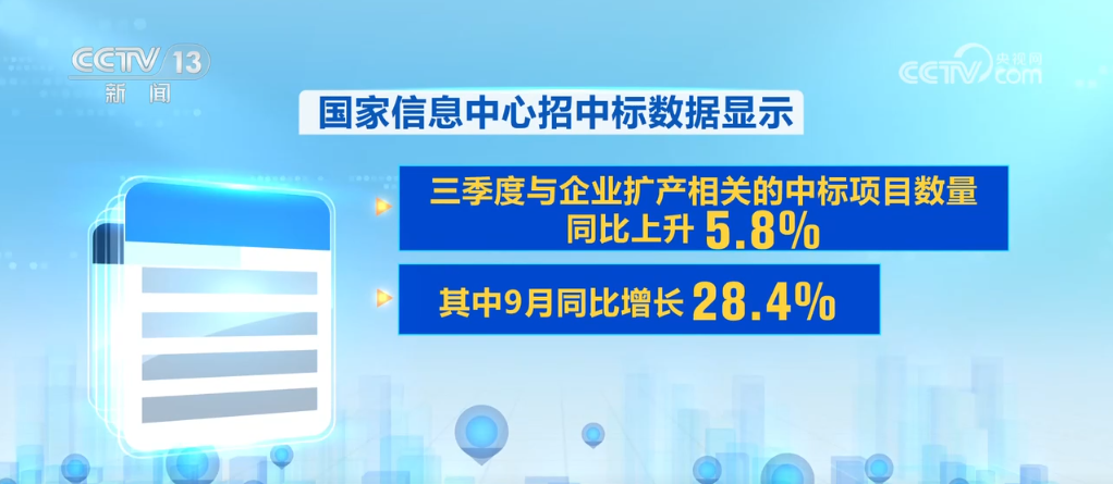 不僅工程建設(shè)在提速,作為項目落地的第一步,中標(biāo)數(shù)據(jù)也在快速增長。國家信息中心招中標(biāo)數(shù)據(jù)顯示,三季度與企業(yè)擴(kuò)產(chǎn)相關(guān)的中標(biāo)項目數(shù)量同比上升5.8%,其中9月同比增長28.4%,為今年以來最高增速,企業(yè)擴(kuò)產(chǎn)熱度回升明顯。