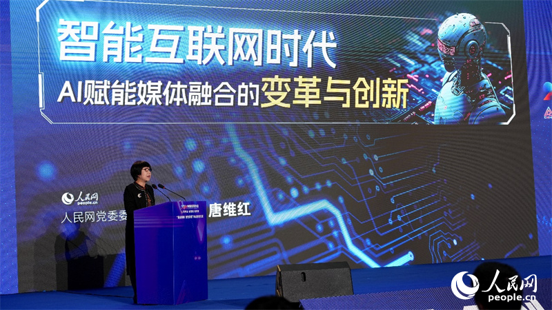 人民網監(jiān)事會主席、研究院院長唐維紅發(fā)表題為《智能互聯(lián)網時代AI賦能媒體融合的變革與創(chuàng)新》的主題報告。人民網記者 吳茜薇攝
