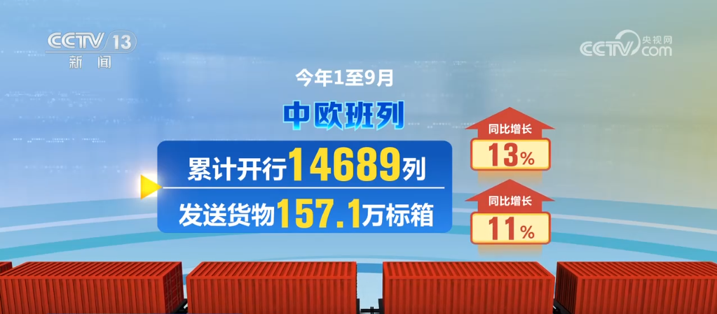 數(shù)據(jù)顯示,今年1至9月,中歐班列累計開行14689列,發(fā)送貨物157.1萬標(biāo)箱,同比分別增長13%、11%。其中9月份開行1633列,發(fā)送貨物17.1萬標(biāo)箱,同比分別增長15%、12%。