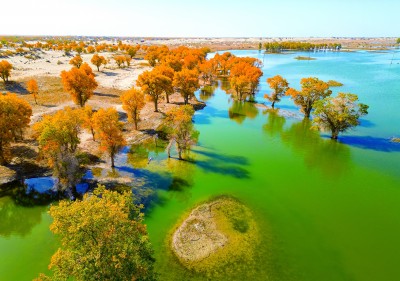 站在高處放眼望去,大片的胡楊林仿佛被溫柔的霞光所籠罩,明黃色的胡楊葉如同滿天繁星,在水面上輕輕搖曳。走進(jìn)胡楊林深處,可見漢唐烽燧、太陽墓、祭臺,每一處文化遺存都透著原始與神秘,仿佛將一個個古老的傳說向人娓娓道來。