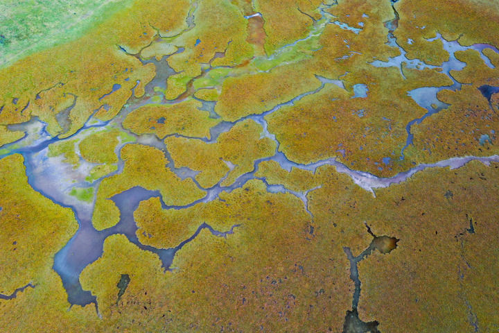 這是2022年9月17日在甘肅省甘南藏族自治州瑪曲縣拍攝的黃河上游重要水源涵養(yǎng)地阿萬倉濕地內(nèi)的一處沼澤景觀。占地562萬畝的瑪曲濕地是世界上保存最完整的濕地之一,被譽(yù)為“黃河之腎”(無人機(jī)照片)。新華社記者 郎兵兵 攝
