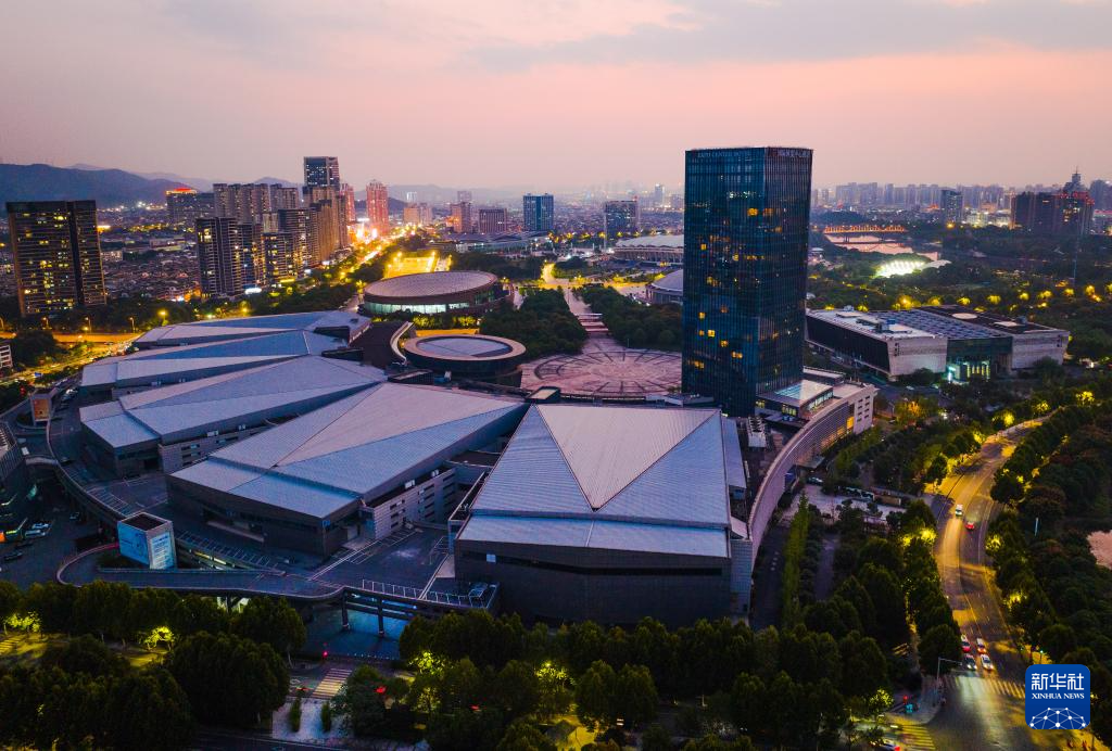 鳥瞰暮色下的義烏(無人機照片,10月9日攝)。新華社記者 翁忻旸 攝