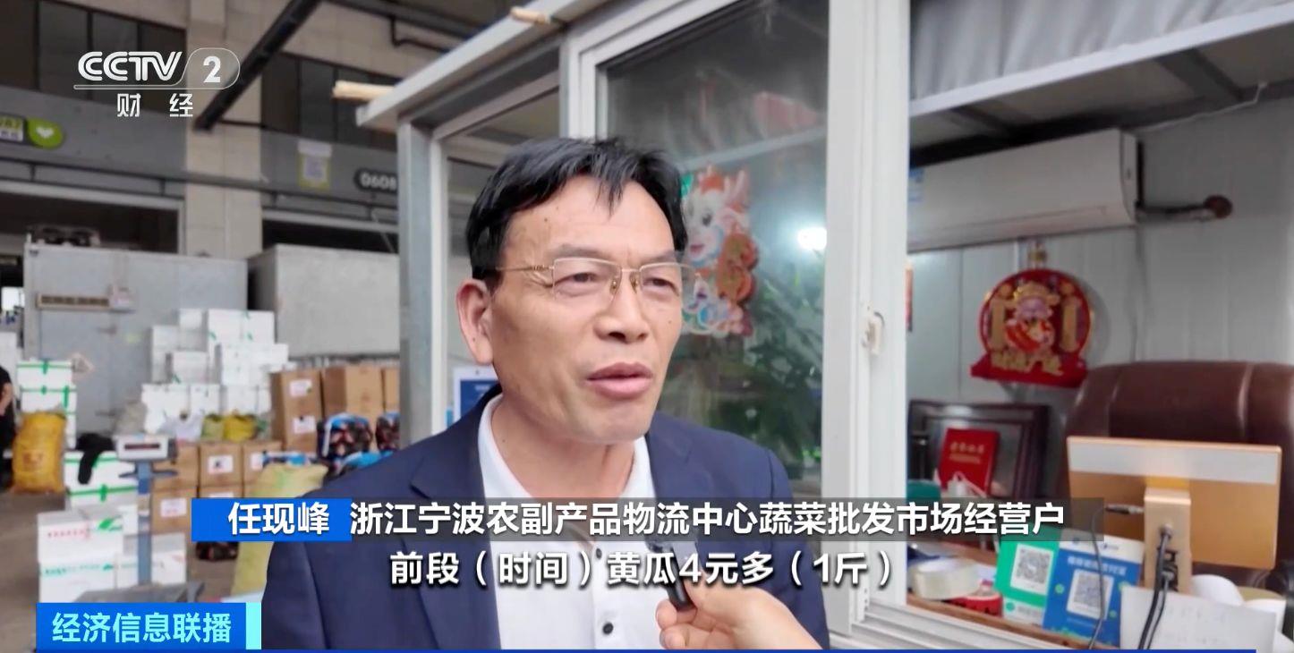 浙江寧波農(nóng)副產(chǎn)品物流中心蔬菜批發(fā)市場經(jīng)營戶 任現(xiàn)峰:黃瓜前段時間4元多一斤,現(xiàn)在降到2元多,降了一半。