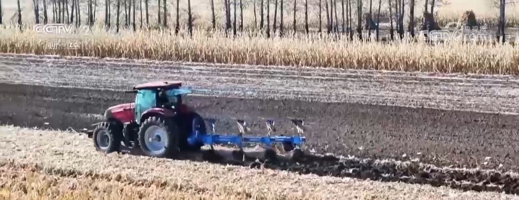 從空中看去,未收獲的地方是呈現(xiàn)金色,收割后的地面,大型的翻地機跟在后面將秸稈直接翻入地下,翻地車一過就露出油汪汪的黑土地了。這些翻完的地之后還要耙平、起壟,這樣第二年開春可以直接種植了。記者在當?shù)夭稍L期間,看到了這些農戶幾乎是24小時晝夜不停在進行收割和秋整地,可以說是“人歇機器不歇”,在搶抓農時,當?shù)赜芯湓捊小敖鹕x田、黑色越冬”。