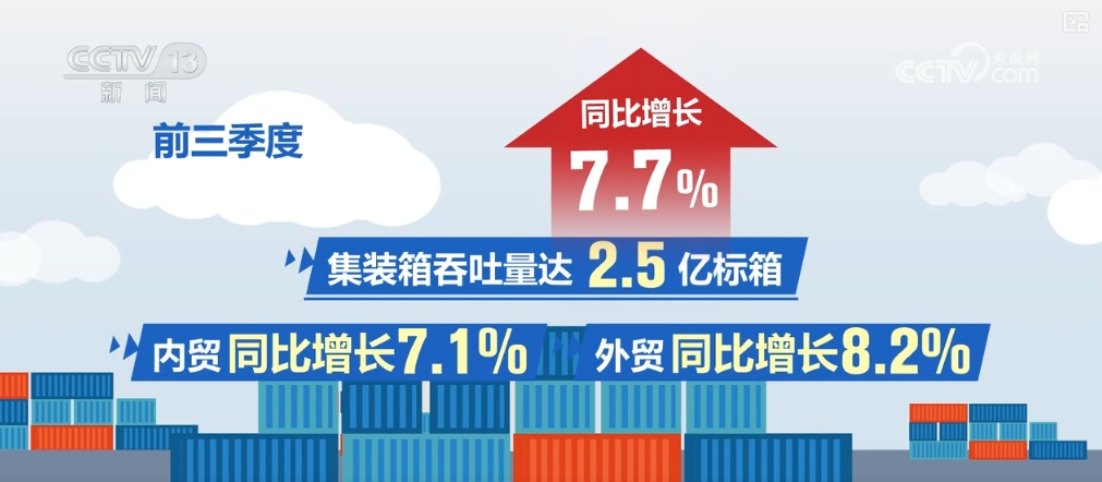前三季度,全國港口貨物吞吐量129.7億噸,同比增長3.4%。其中,內貿、外貿同比分別增長1.7%和7.6%。集裝箱吞吐量達2.5億標箱,同比增長7.7%。其中,內貿、外貿同比分別增長7.1%和8.2%。