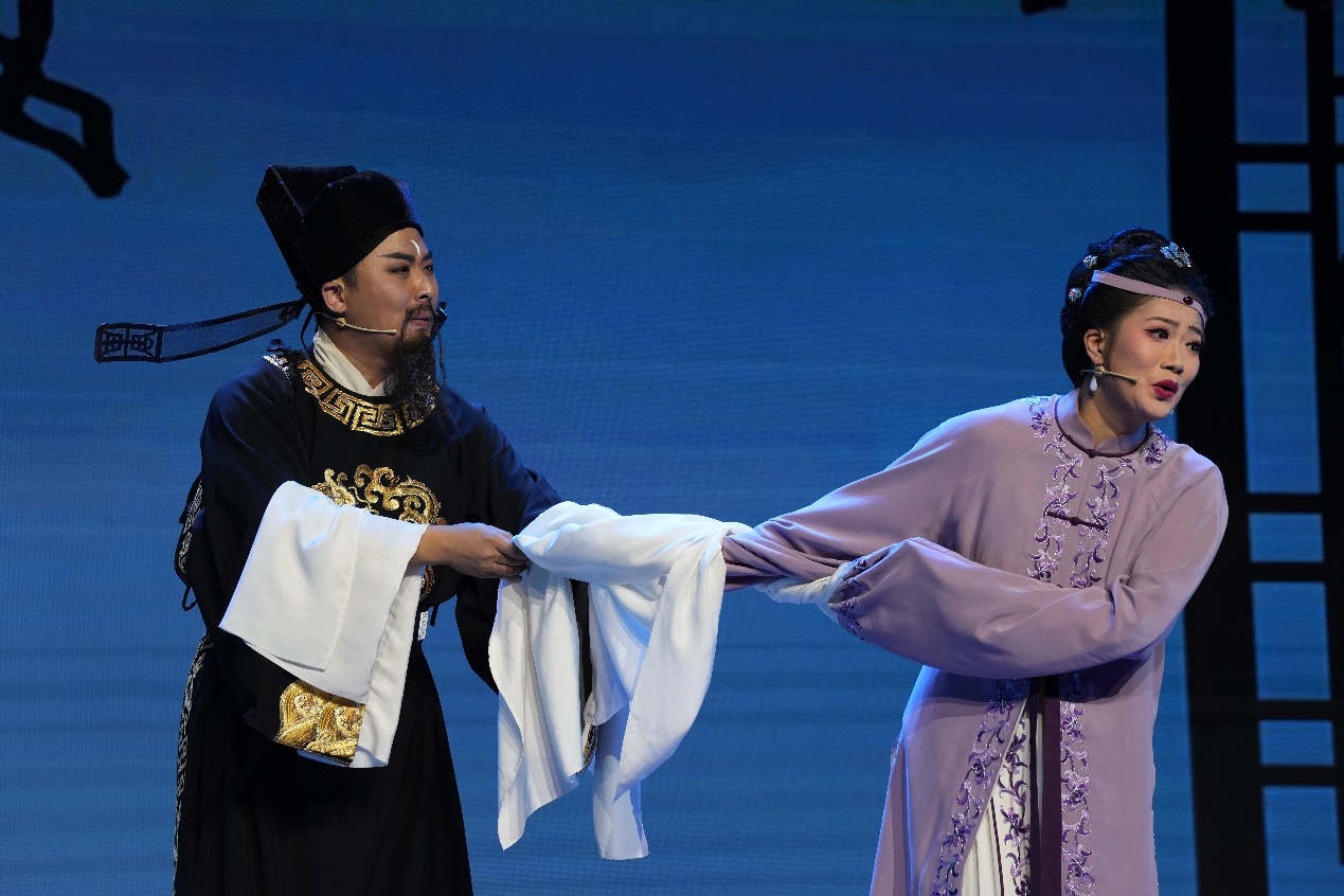 舞臺上,數(shù)位穿著皖北傳統(tǒng)服裝的表演者用花鼓舞蹈表演和花鼓說唱的形式,展現(xiàn)網(wǎng)絡(luò)法律法規(guī)普及宣傳和網(wǎng)絡(luò)詐騙案例警示教育,讓小花鼓唱響新內(nèi)容,也讓在場的觀眾直呼過癮。