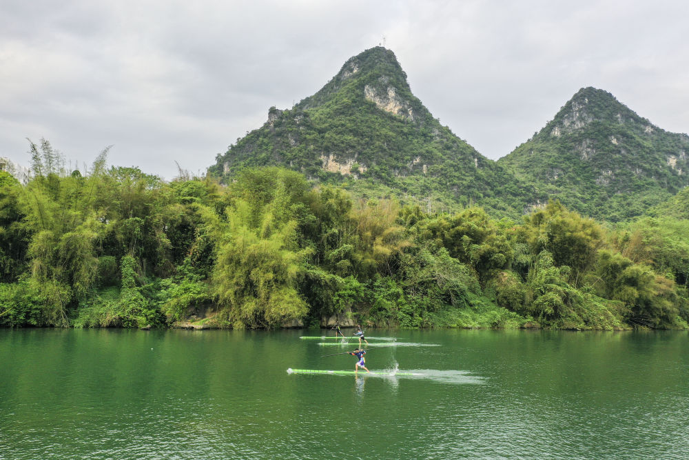 河池學(xué)院獨竹漂隊在環(huán)江河上表演。新華社發(fā)(高東風(fēng) 攝)