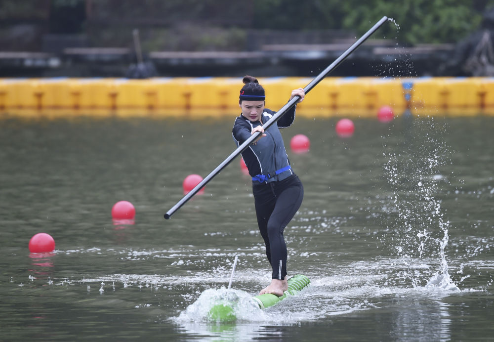 2019年4月4日,河池學(xué)院獨竹漂隊的隊員在廣西桂林市舉行的“民族體育炫”系列比賽中參加獨竹漂項目的比賽。