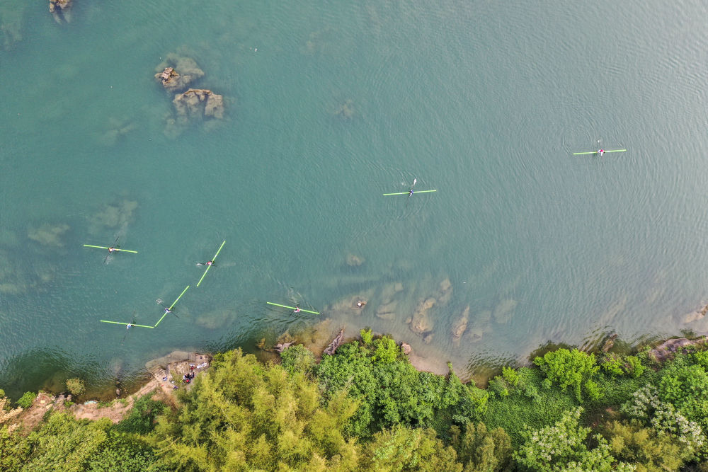 4月9日,河池學(xué)院獨竹漂隊的隊員們在自然河道里訓(xùn)練。