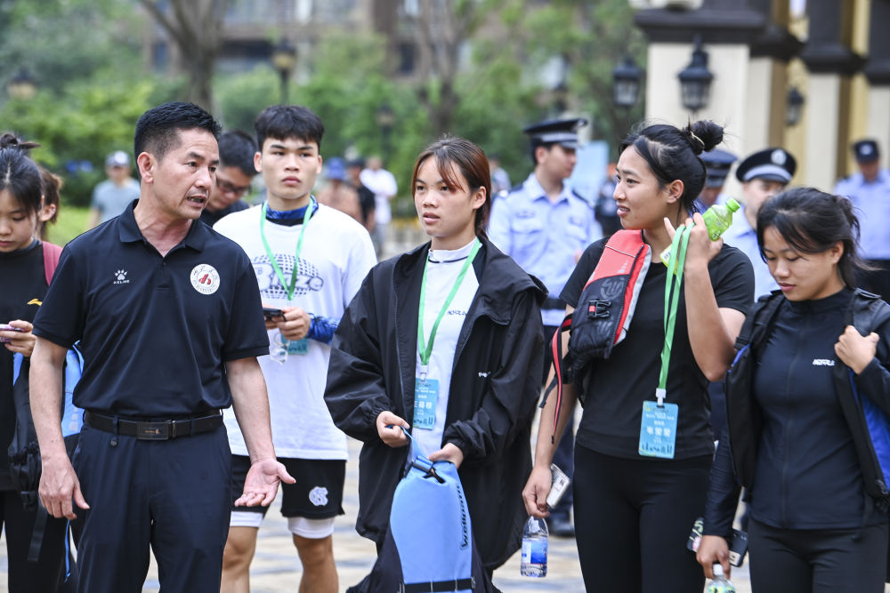6月19日,藍(lán)建卓(右)在觀看獨竹漂隊隊員的訓(xùn)練。