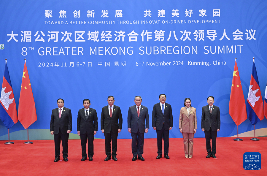 11月7日,國務院總理李強在昆明出席大湄公河次區(qū)域經濟合作第八次領導人會議。這是李強同出席會議的柬埔寨、老撾、緬甸、泰國、越南政府首腦和亞洲開發(fā)銀行行長合影。新華社記者 殷博古 攝
