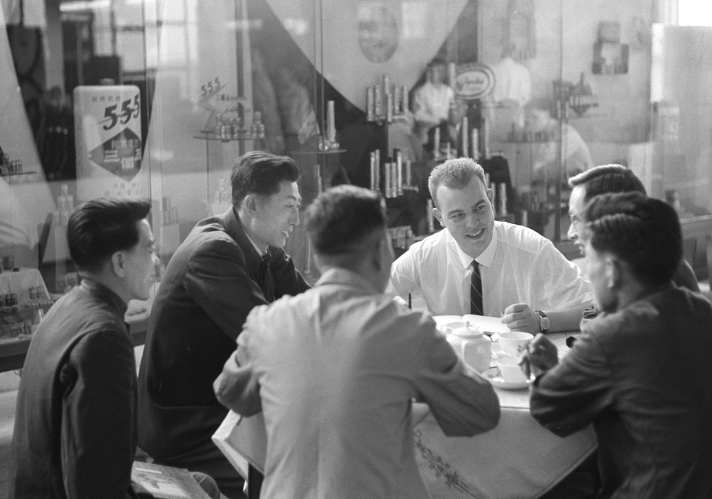 1965年,挪威商人萊伊夫·斯契瓦伯和中國(guó)交易團(tuán)工作人員在第17屆廣交會(huì)上洽談交易。新華社記者 蔡忠植 攝