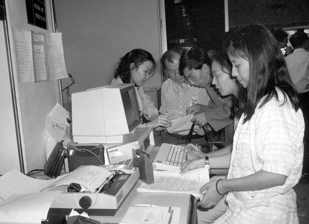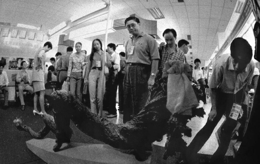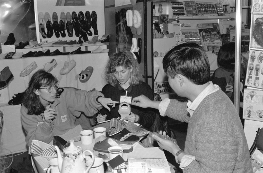 1991年3月,在上海舉行的首屆華東出口商品交易會(huì)(后發(fā)展為華東進(jìn)出口商品交易會(huì),簡(jiǎn)稱“華交會(huì)”)上,兩名意大利客商同浙江省輕工業(yè)品進(jìn)出口公司代表洽談業(yè)務(wù)。新華社記者 柳中央 攝