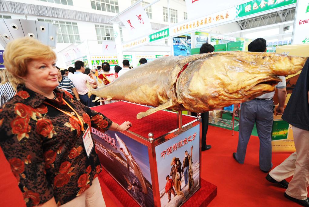 2008年6月15日,在第19屆中國(guó)哈爾濱國(guó)際經(jīng)濟(jì)貿(mào)易洽談會(huì)(后與中國(guó)-俄羅斯博覽會(huì)合并舉辦)上,一位客商在鱘鰉魚標(biāo)本旁留影。新華社記者 王建威 攝