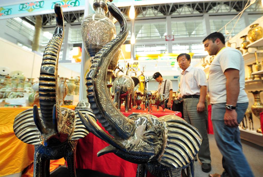 2013年9月15日,在寧夏銀川舉行的首屆中國(guó)-阿拉伯國(guó)家博覽會(huì)上,觀展者咨詢選購(gòu)巴基斯坦展區(qū)的特色展品黃銅雕塑。