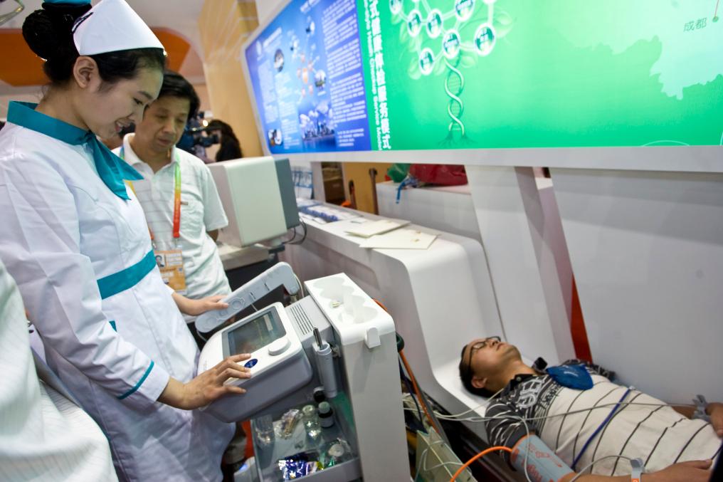 2012年5月28日,觀眾在首屆中國(guó)(北京)國(guó)際服務(wù)貿(mào)易交易會(huì)(簡(jiǎn)稱“京交會(huì)”,后發(fā)展為中國(guó)國(guó)際服務(wù)貿(mào)易交易會(huì),即“服貿(mào)會(huì)”)體驗(yàn)全方位健康體檢。新華社發(fā)(趙冰 攝)