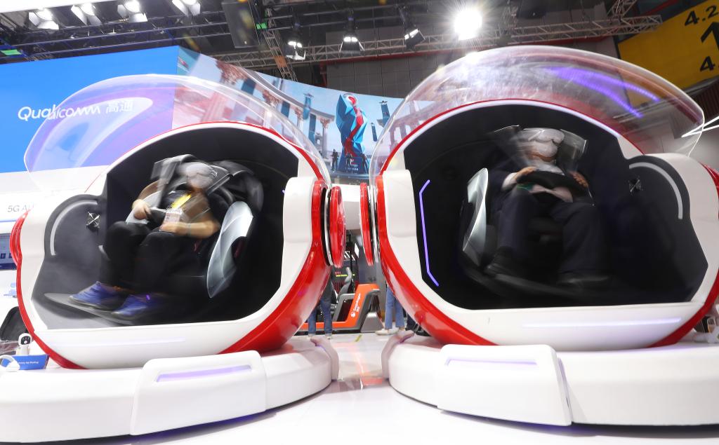 2022年11月5日,參觀者在第五屆進(jìn)博會(huì)技術(shù)裝備展區(qū)體驗(yàn)一款VR游戲座椅。新華社記者 方喆 攝