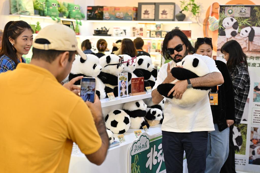 2024年9月16日,國(guó)外參觀者在服貿(mào)會(huì)首鋼園區(qū)文旅服務(wù)專題展區(qū)抱著北京動(dòng)物園推出的大熊貓文創(chuàng)玩偶合影。新華社記者 李鑫 攝