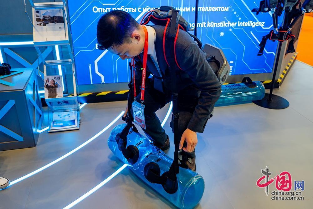 觀眾體驗(yàn)外骨骼機(jī)器人在工作中的實(shí)際應(yīng)用。中國(guó)網(wǎng)記者