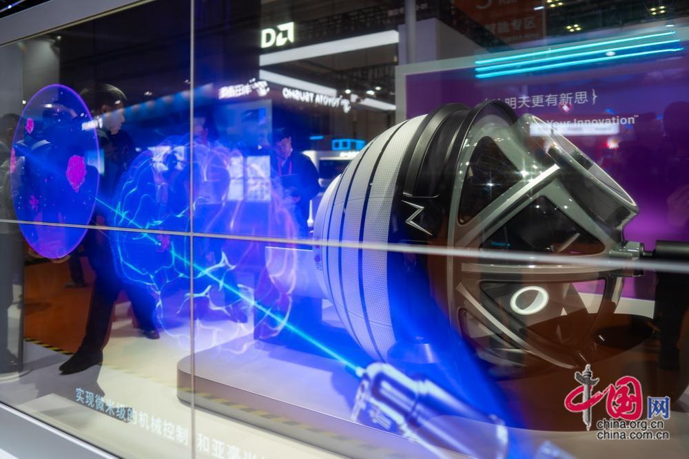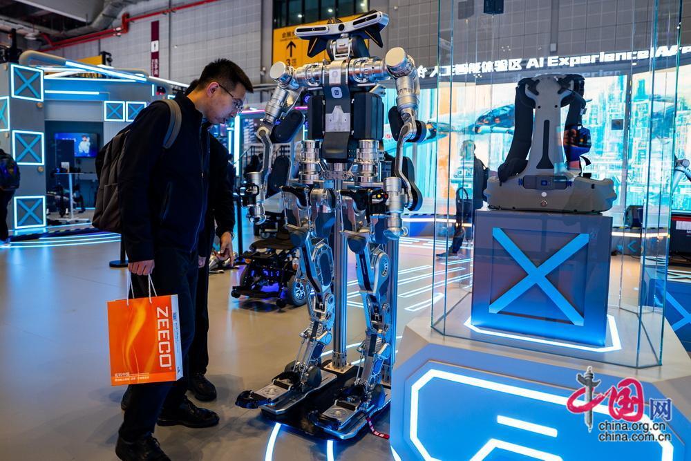 觀眾在智能裝備展示區(qū)圍觀新型外骨骼機(jī)器人。中國(guó)網(wǎng)記者