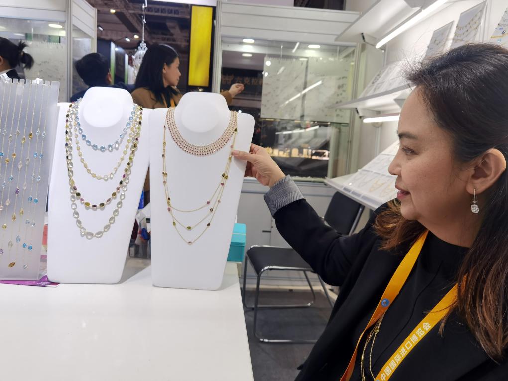 得益于共建“一帶一路”倡議和中國(guó)-東盟自由貿(mào)易協(xié)定的深化落實(shí),阿拉尼婭一家的珠寶企業(yè)有了進(jìn)軍中國(guó)廣袤市場(chǎng)的新計(jì)劃。這次她和家人帶來(lái)的珠寶飾品多達(dá)上百種款式,有鑲嵌紅寶石、祖母綠、碧璽等的項(xiàng)鏈、手鏈、戒指、吊墜等,吸引采購(gòu)方駐足。