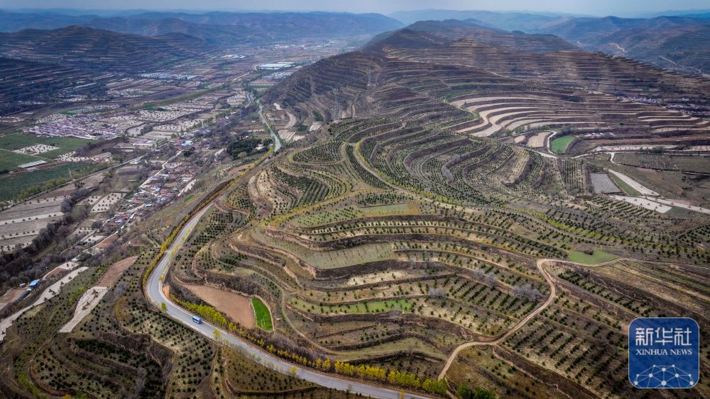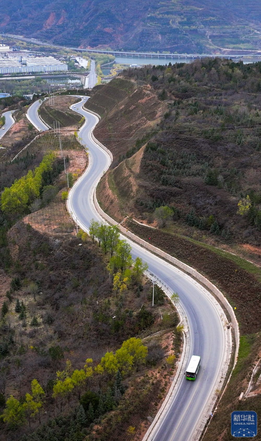 11月9日,一輛載有乘客和快遞物品的公交車從隆德縣城駛出(無(wú)人機(jī)照片)。
