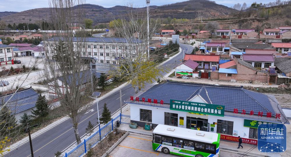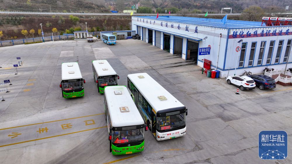 載有快遞物品的城鄉(xiāng)公交車即將從隆德縣公交公司駛出(11月9日攝,無(wú)人機(jī)照片)。