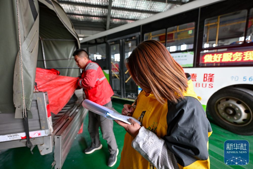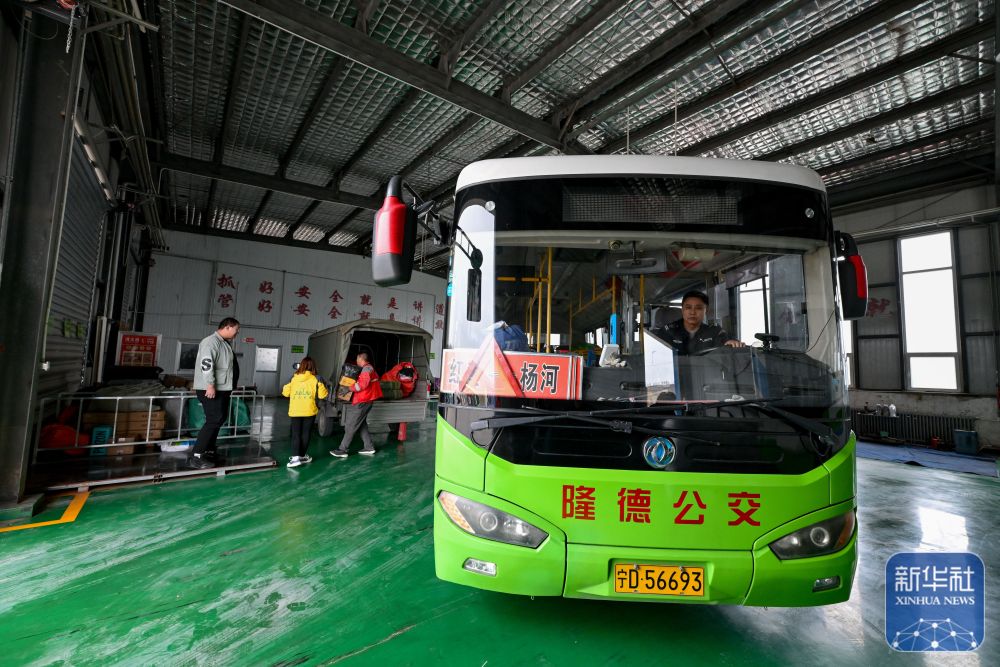 11月9日,一輛載有快遞物品的城鄉(xiāng)公交車從隆德公交公司倉(cāng)庫(kù)駛出。