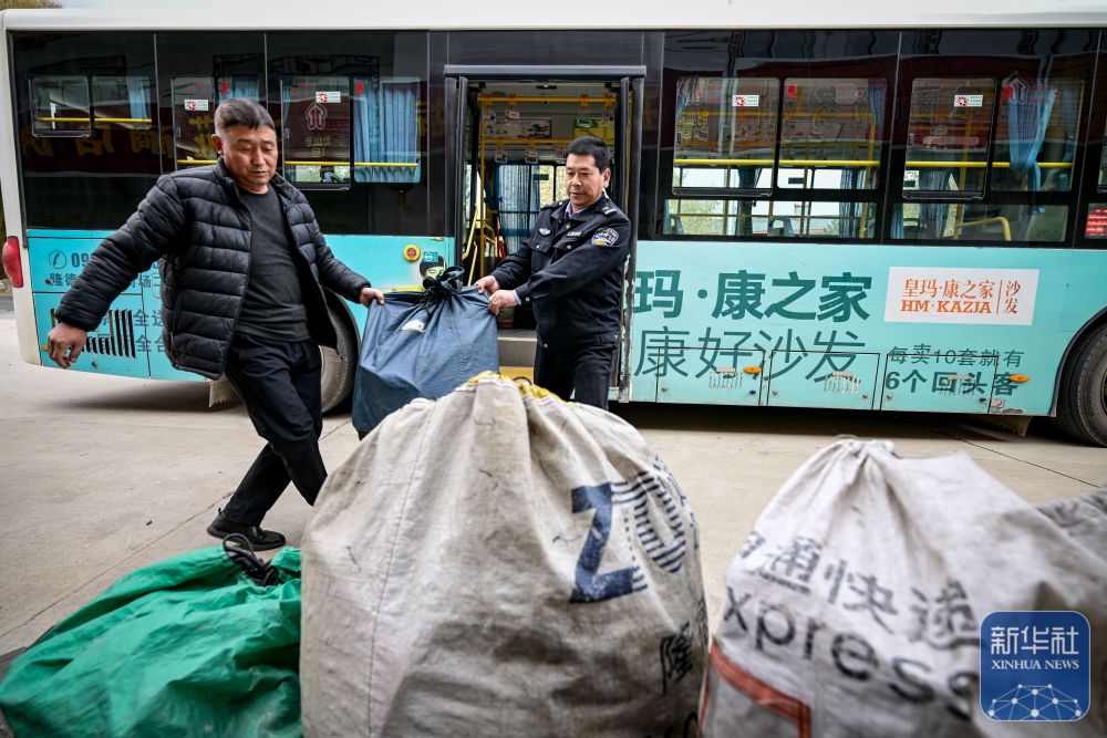 11月10日,隆德縣公交車司機(jī)(左)和聯(lián)財(cái)鎮(zhèn)聯(lián)合村快遞點(diǎn)經(jīng)營(yíng)者將快遞卸下公交車。