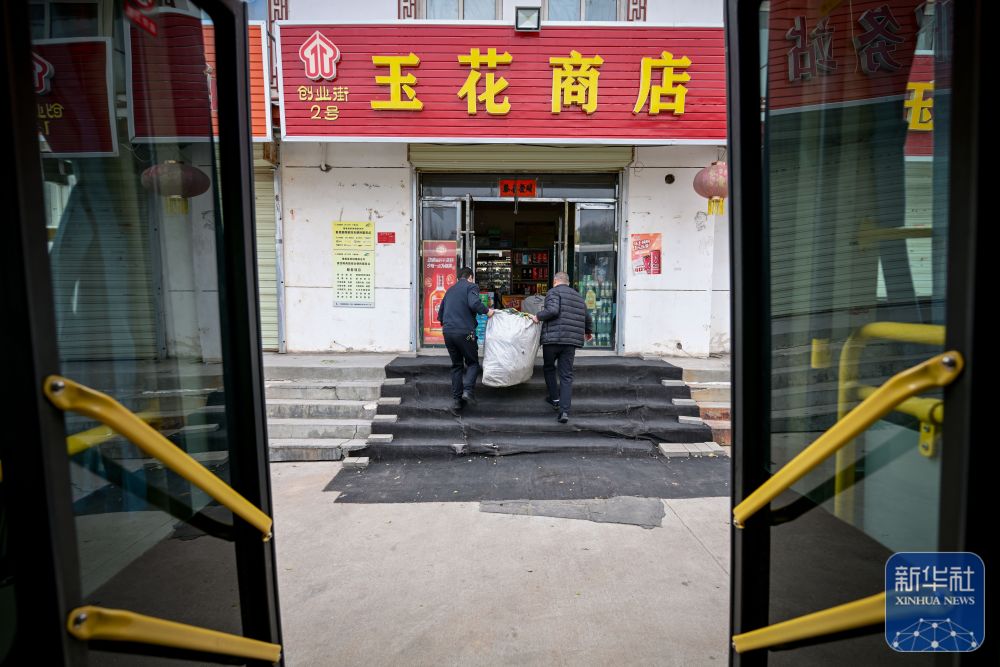 11月10日,隆德縣公交車司機(jī)(右)和聯(lián)財(cái)鎮(zhèn)聯(lián)合村快遞點(diǎn)經(jīng)營(yíng)者將快遞卸下公交車。