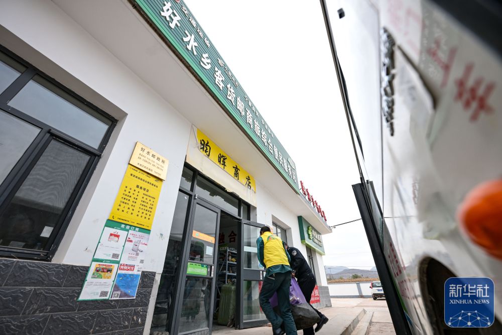 11月9日,隆德縣公交車司機(jī)和好水鄉(xiāng)客貨郵商旅綜合便民服務(wù)站經(jīng)營(yíng)者從公交車上卸下快遞物品。