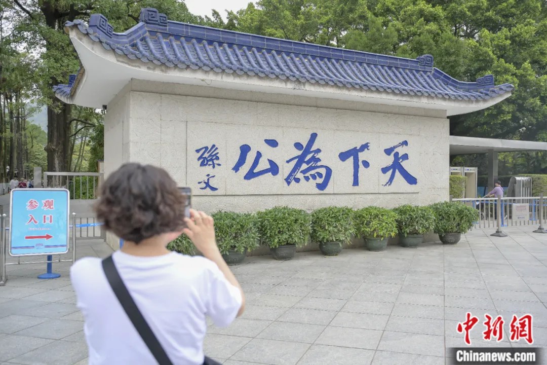 2024年3月30日,孫中山故居紀念館外正門處的“天下為公”石碑吸引游客。中新社記者 陳驥旻 攝