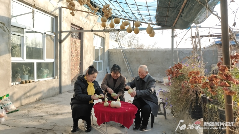11月2日,帕提古麗·艾沙(左)、陳新萍(中)和托合地·吾守(右)正在院子里給葫蘆去皮,等晾干以后制作手工藝品。阿依古麗·庫(kù)完攝