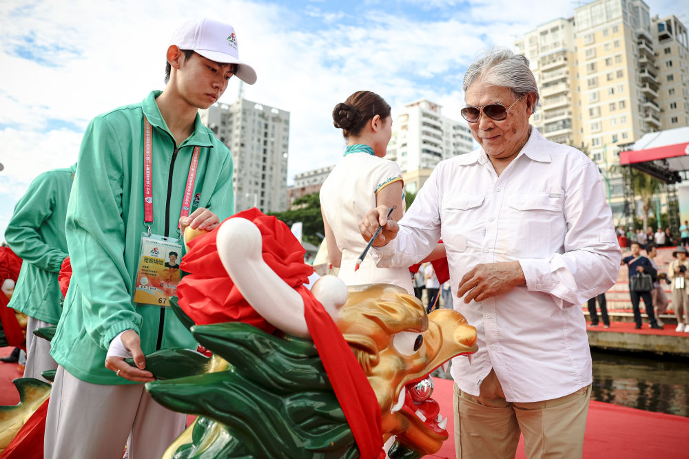 11月23日,中國香港體育協(xié)會暨奧林匹克委員會會長霍震霆(右一)在賽前儀式上為龍舟“點(diǎn)睛”。新華社記者 江漢 攝
