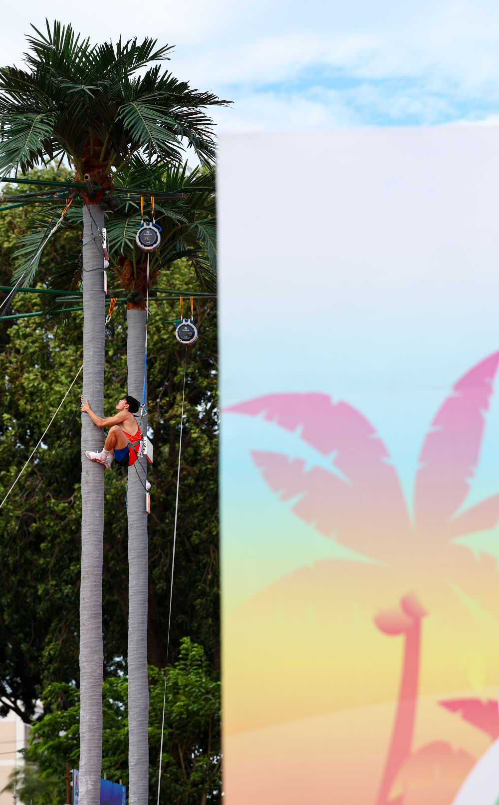 相比在運(yùn)動會上歷史悠久的龍舟,當(dāng)日上演的攀椰競速則是在本屆賽事首次撞入人們的眼簾。在椰子樹上手腳并用攀爬,迅速抵達(dá)頂端,不問可知,這一競技性與趣味性兼具的運(yùn)動脫胎于海南當(dāng)?shù)厝罕妭鹘y(tǒng)的徒手爬樹摘椰子場景。