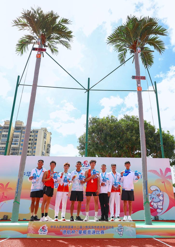 11月24日,獲獎(jiǎng)選手在頒獎(jiǎng)儀式上合影。當(dāng)日,第十二屆全國少數(shù)民族傳統(tǒng)體育運(yùn)動(dòng)會(huì)攀椰競速男子9米決賽在西南大學(xué)三亞中學(xué)體育場舉行。新華社記者 楊植森 攝
