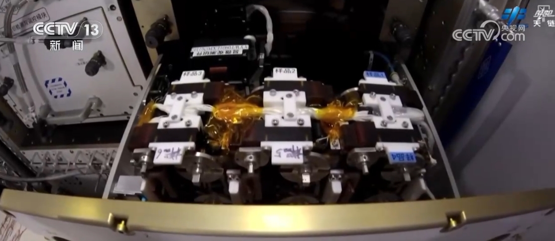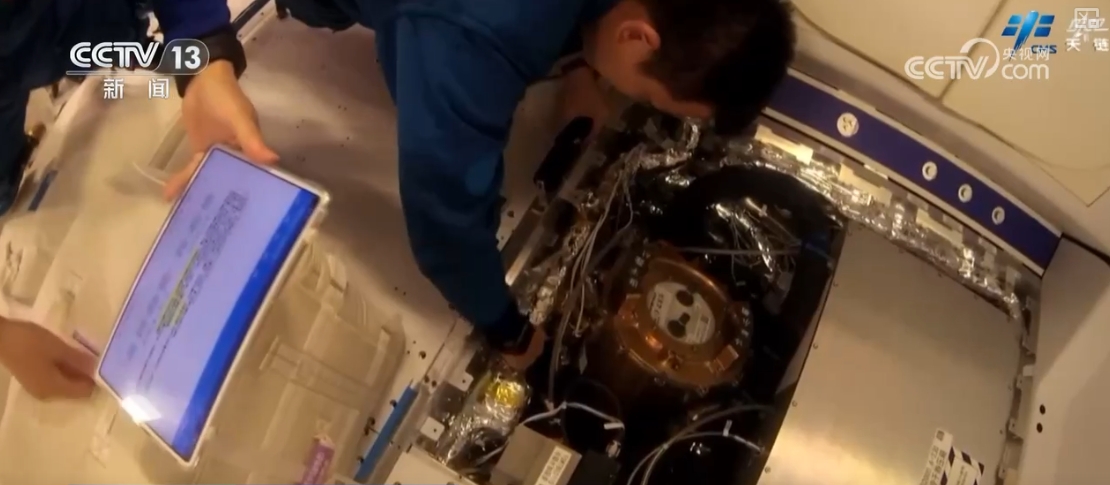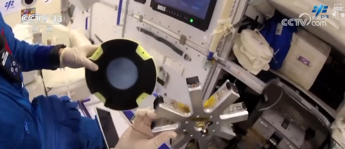 乘組還完成了流體物理實驗柜固液介觀實驗單元樣品盤檢查、實驗樣品更換,無容器柜實驗腔體樣品清理、實驗樣品更換、軸心機(jī)構(gòu)電極維護(hù)等多項操作。