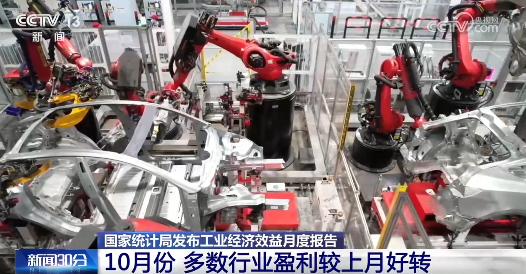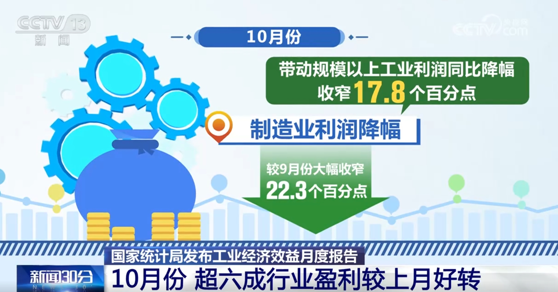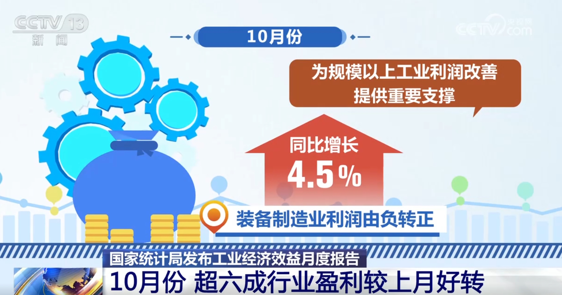 國家統(tǒng)計局最新發(fā)布的數(shù)據(jù)顯示,10月份,隨著存量政策及一攬子增量政策協(xié)同發(fā)力、持續(xù)顯效,規(guī)模以上工業(yè)企業(yè)生產(chǎn)穩(wěn)定增長,企業(yè)利潤當月降幅明顯收窄,多數(shù)行業(yè)盈利較上月好轉(zhuǎn)。