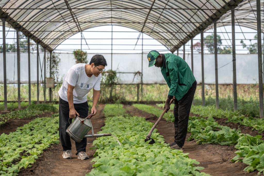 2024年8月3日,在剛果(布)首都布拉柴維爾的中國(guó)援剛果(布)農(nóng)業(yè)技術(shù)示范中心內(nèi),中方農(nóng)業(yè)專家李科明(左)與當(dāng)?shù)貑T工在大棚內(nèi)耕作。(新華社記者鄭揚(yáng)子攝)