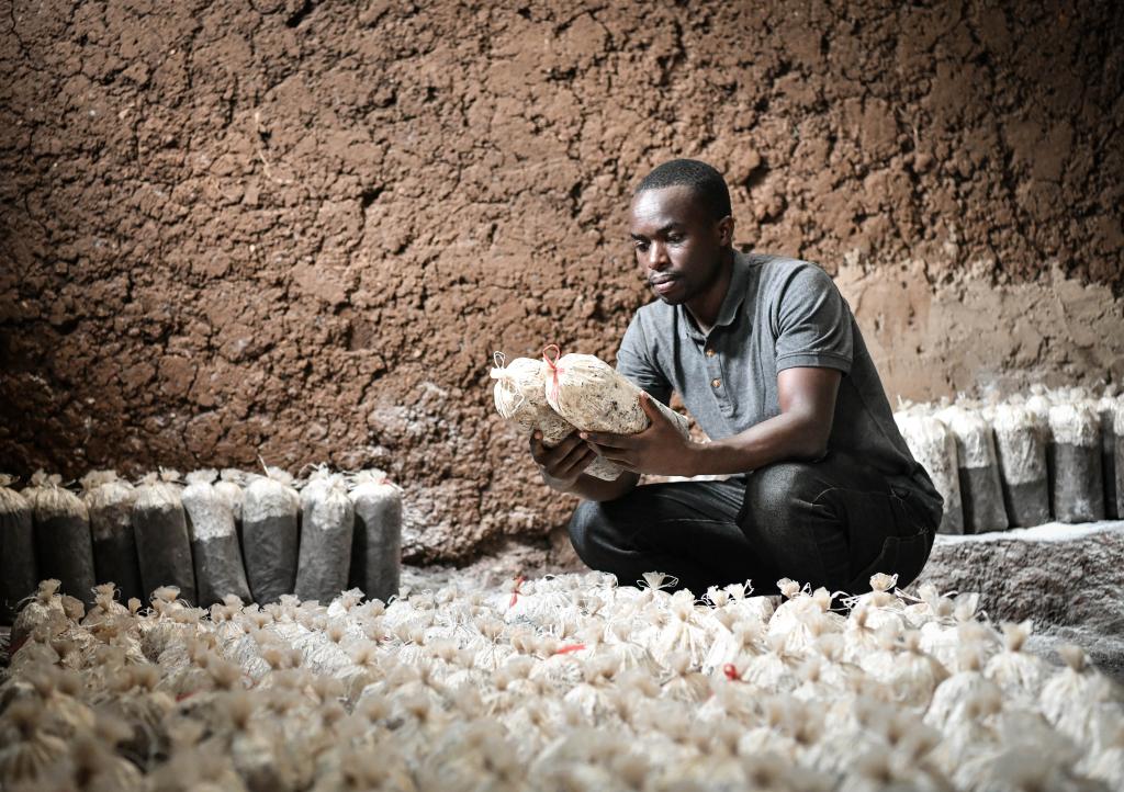 2024年8月14日,在盧旺達(dá)南方省穆漢加區(qū),尼揚(yáng)博·奧貝德在食用菌培育工坊內(nèi)檢查菌袋。曾兩次赴中國(guó)進(jìn)行菌草技術(shù)培訓(xùn)的尼揚(yáng)博·奧貝德在南方省和東方省各擁有一家工坊。(新華社記者韓旭攝)
