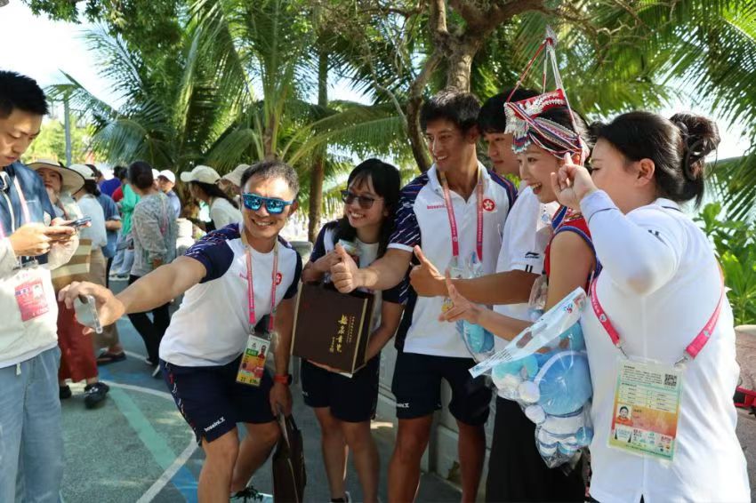 在運(yùn)動會毽球場館,每支參賽隊(duì)伍都收到了香港代表團(tuán)贈送的毽球掛飾或龍形胸針。西藏代表團(tuán)的壯族小伙韋盛森計(jì)劃回贈具有壯族特色的“繡球”;而早就與香港運(yùn)動員因毽球結(jié)緣的廣東隊(duì)老將孫麗艷則決定——等香港隊(duì)在圣誕節(jié)到廣東集訓(xùn)時,她要給老朋友回贈實(shí)用的禮物。