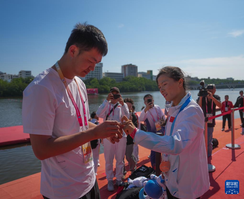 11月28日,何國潤(右)的男朋友向她求婚。當日,在海南省三亞市舉行的第十二屆全國少數(shù)民族傳統(tǒng)體育運動會獨竹漂女子組200米直道賽頒獎儀式后,海南隊選手何國潤的男朋友在頒獎儀式現(xiàn)場向她求婚,上演溫情一幕。新華社發(fā)(杜笑微 攝)
